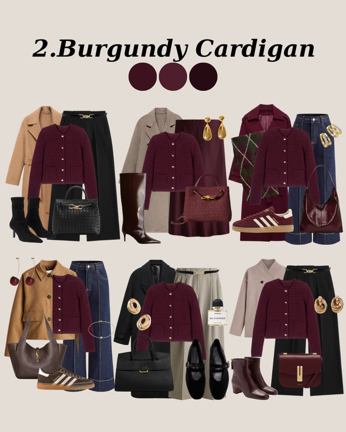 A burgundy cardigan adds emotional depth to any wardrobe. Where beige and black feel safe, burgundy feels rich and confident. It’s an easy way to incorporate color into your classy outfits without breaking the tone-on-tone harmony that defines capsule styling.